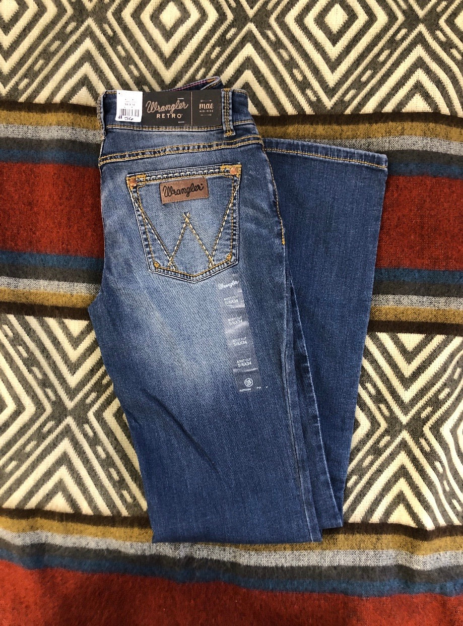 Ladies Wrangler Retro Mid-Rise Boot Cut Jeans. Features the classic W stitching and leather patch logo on the pockets