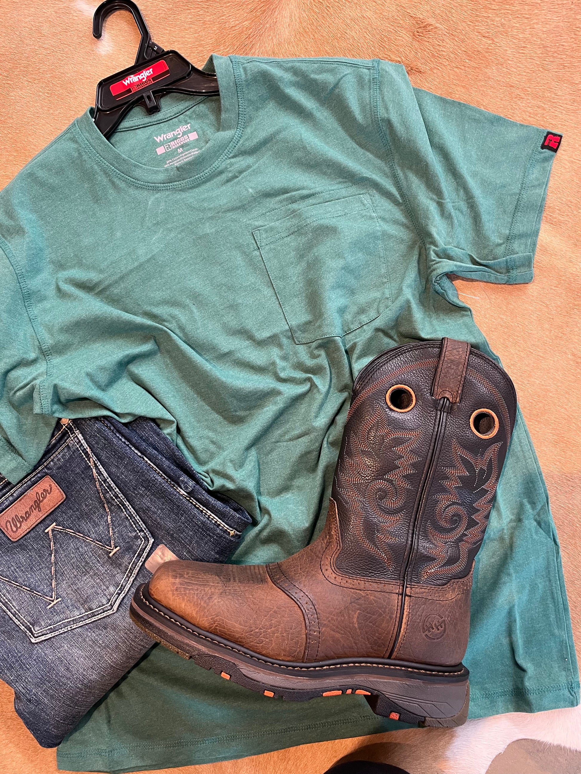 Every man needs a simple short-sleeve shirt that works perfectly on its own or as a base layer on colder days. Luckily, our men's Wrangler® RIGGS WORKWEAR® short-sleeve t-shirt is made with hard-working men in mind. This versatile work shirt is made of performance fibers and features our Room2Move® fit for greater freedom of movement, so you can tackle tough jobs without worrying if it will keep up. Thi men's casual short-sleeve shirt features a ribbed crew neck and left chest pocket. Plus, our RIGGS WORKWEAR® T-shirt comes with a limited lifetime warranty, a “tagless” label for all-day comfort, and flat seams for long-lasting durability.