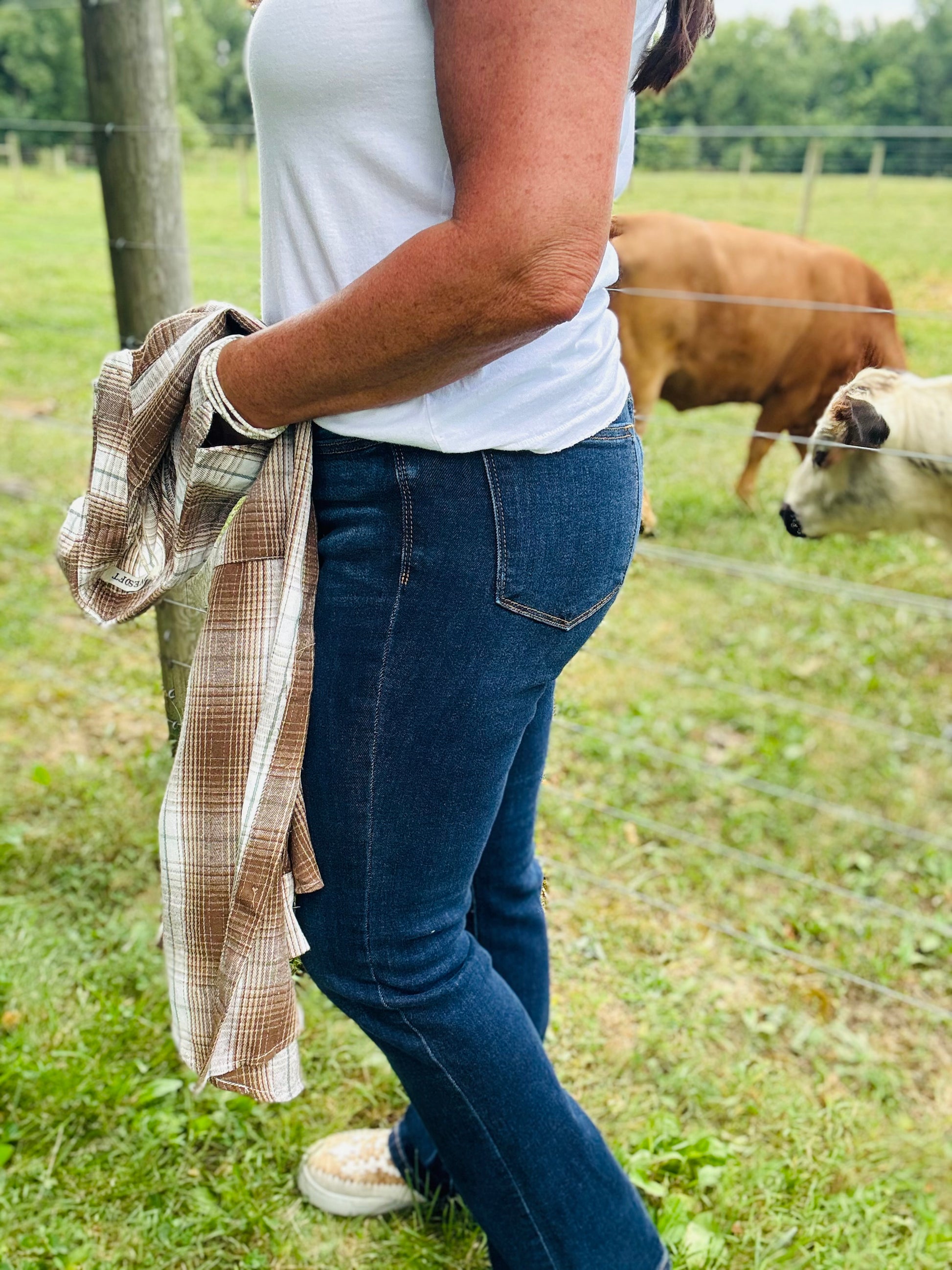 Mid Rise Boot Cut. A Dark Wash Denim with some lighter tones and whisking throughout. Non Distressed and No Holes for a more sophisticated look.