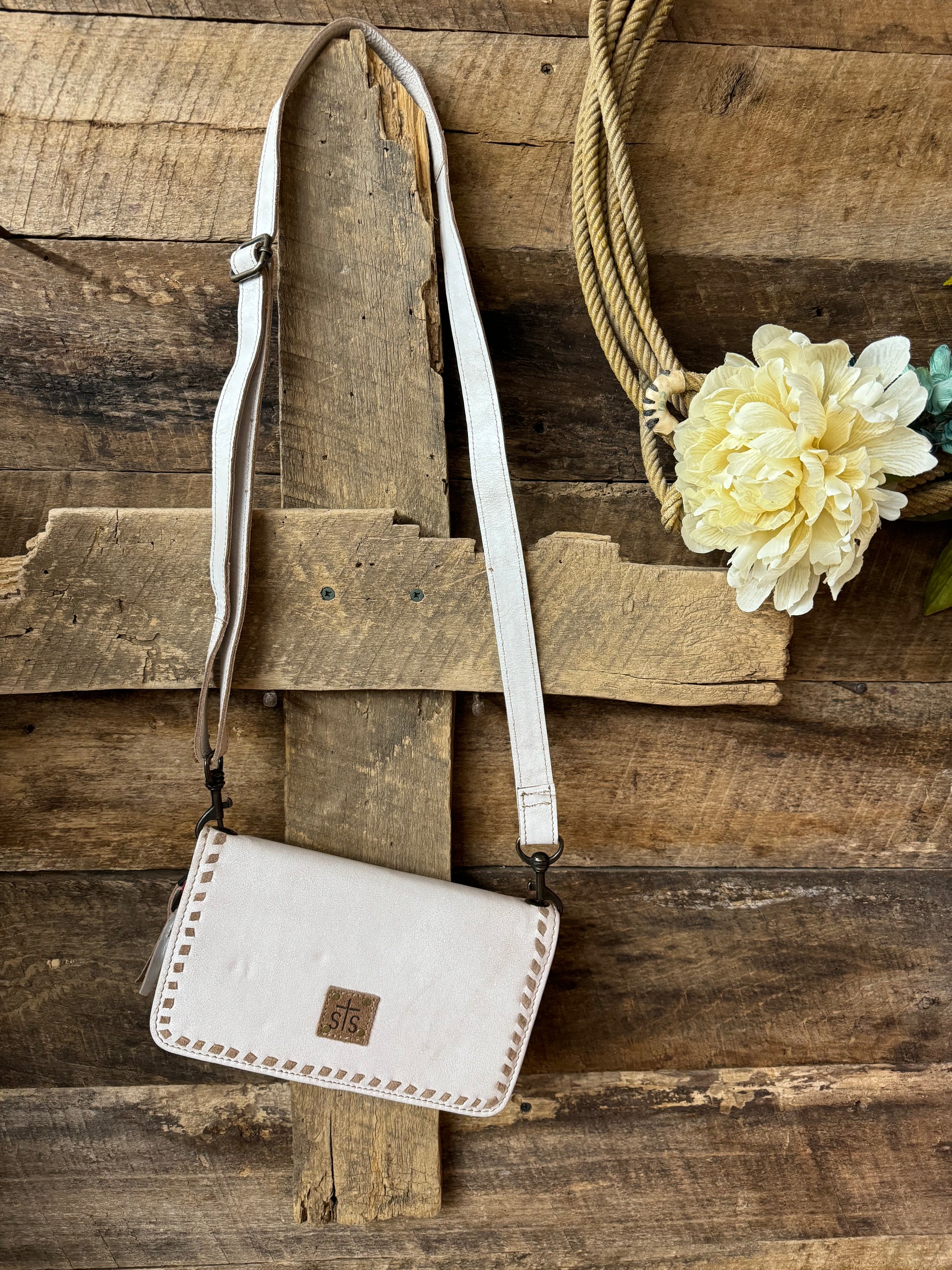 The Cremello Evie Organizer features full grain leather which is crackled to reveal an under crust of soft tanned suede. That same soft tan suede is seen in buck stitch and threaded accents. Finished with distressed hardware for the perfect addition to your wardrobe.