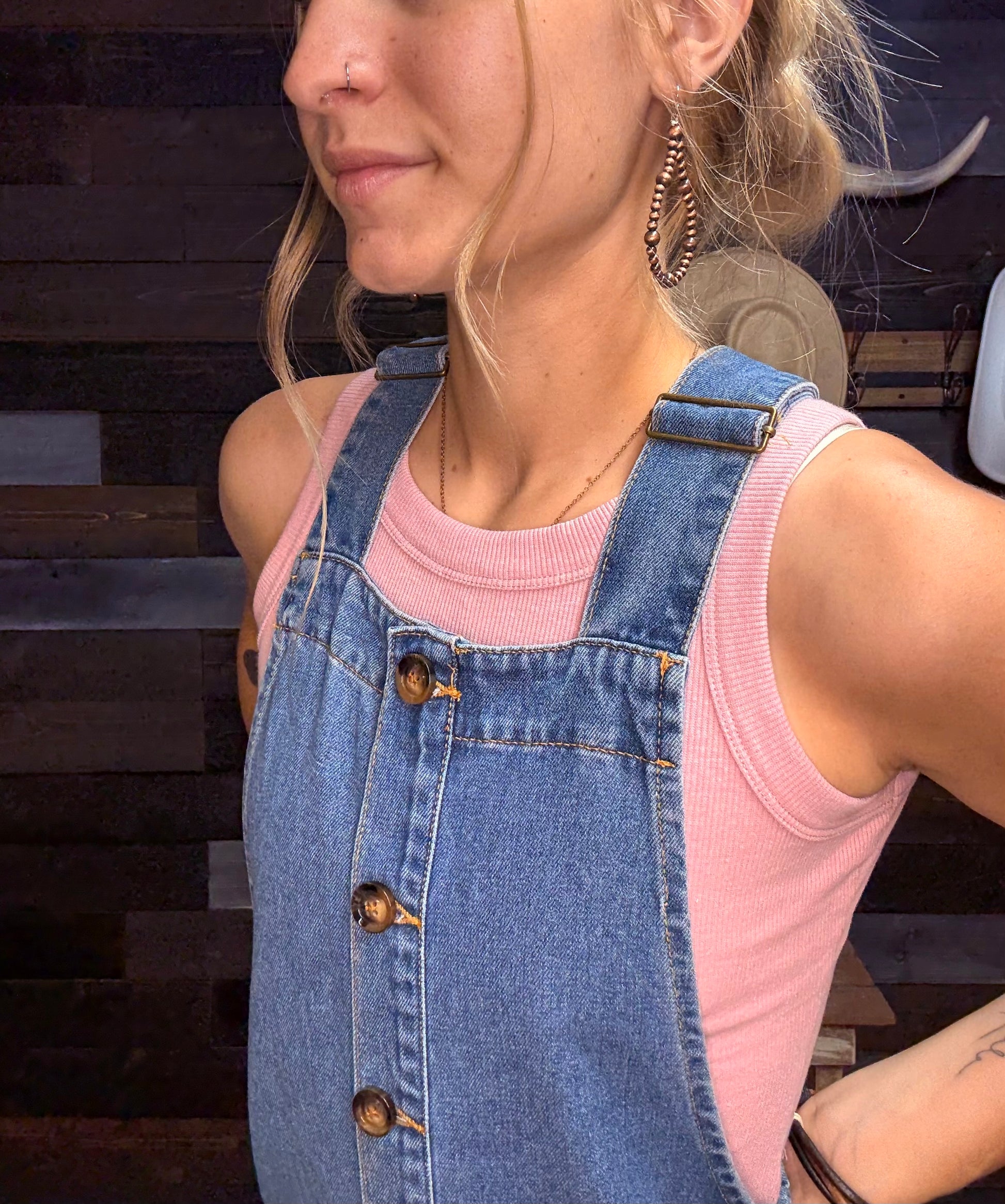 A medium wash denim mini dress that is perfect for a fun day out with the girls or hangin' with the hubby