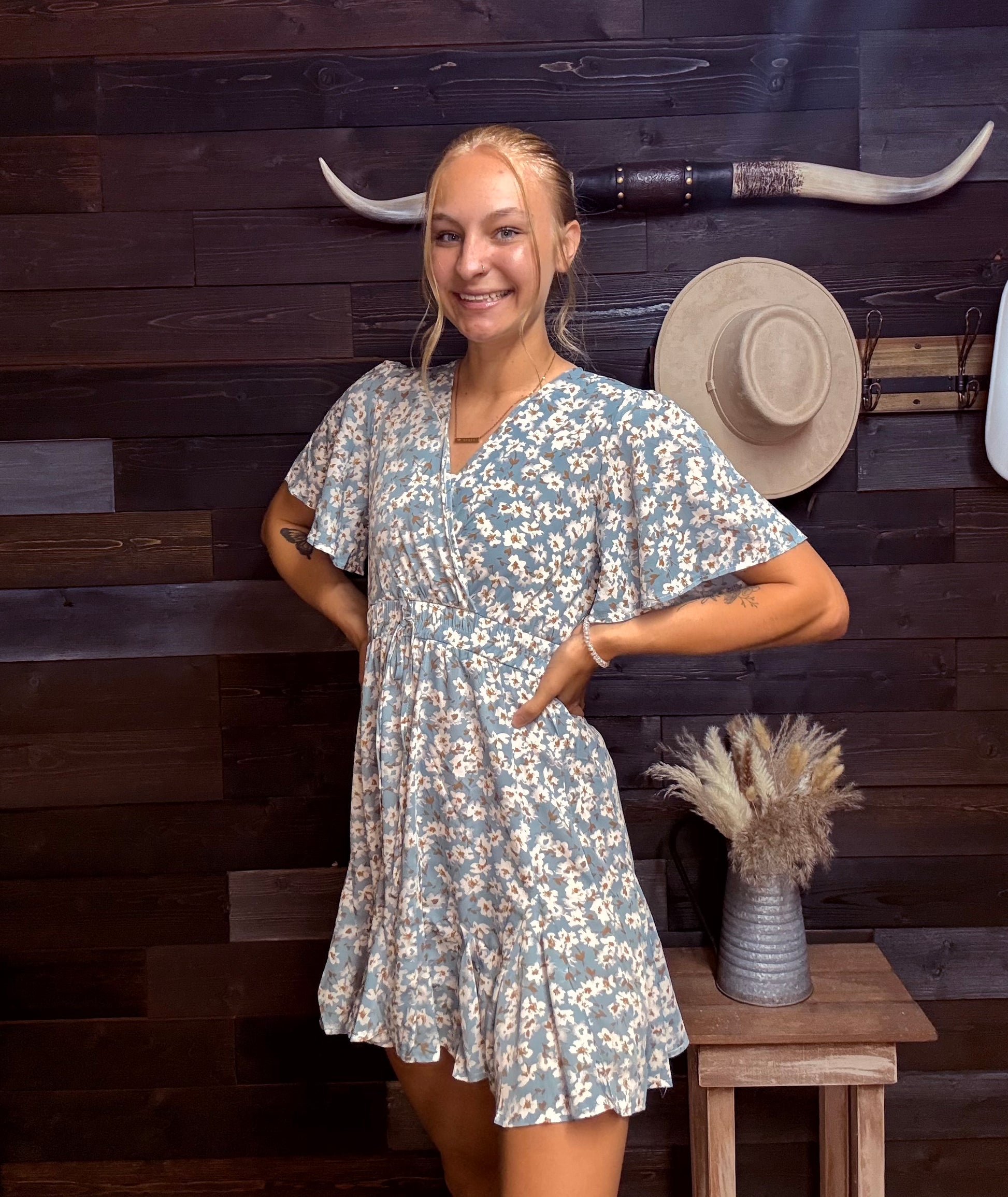 A V-neck floral ruffled pleated dress that will great for so many occasions, weddings, graduations, baby and bridal showers, easter, and of course church