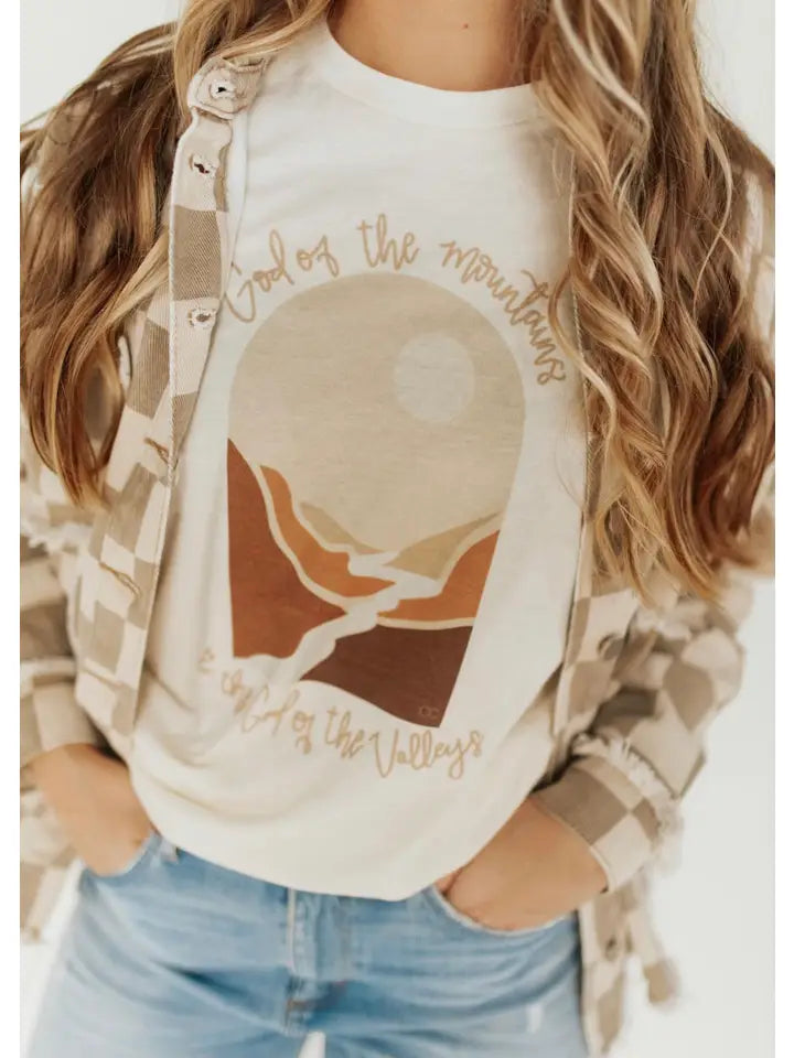 A Spiritual Graphic Tee in cream with neutral colors. " God of the mountains God of the valleys