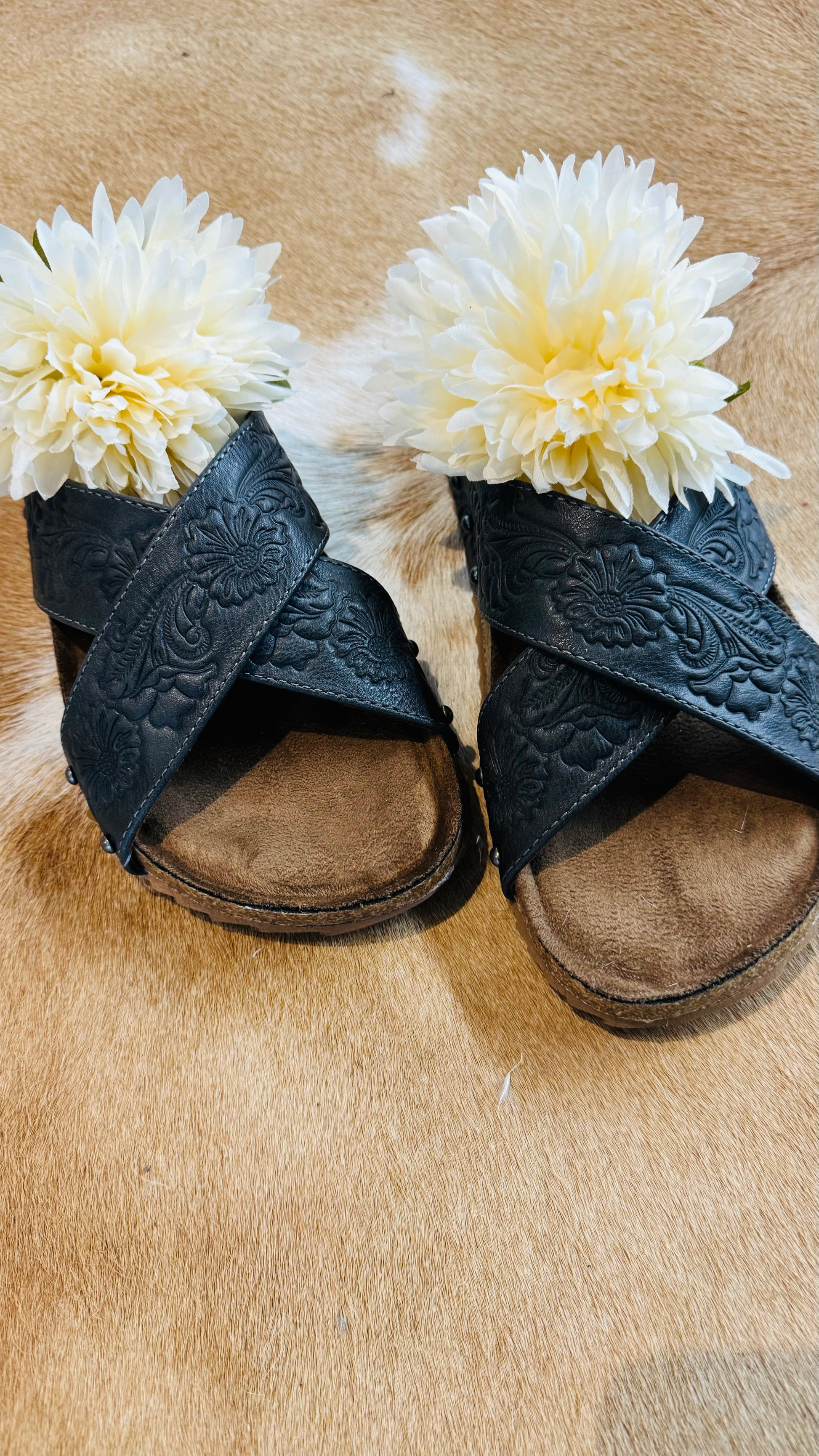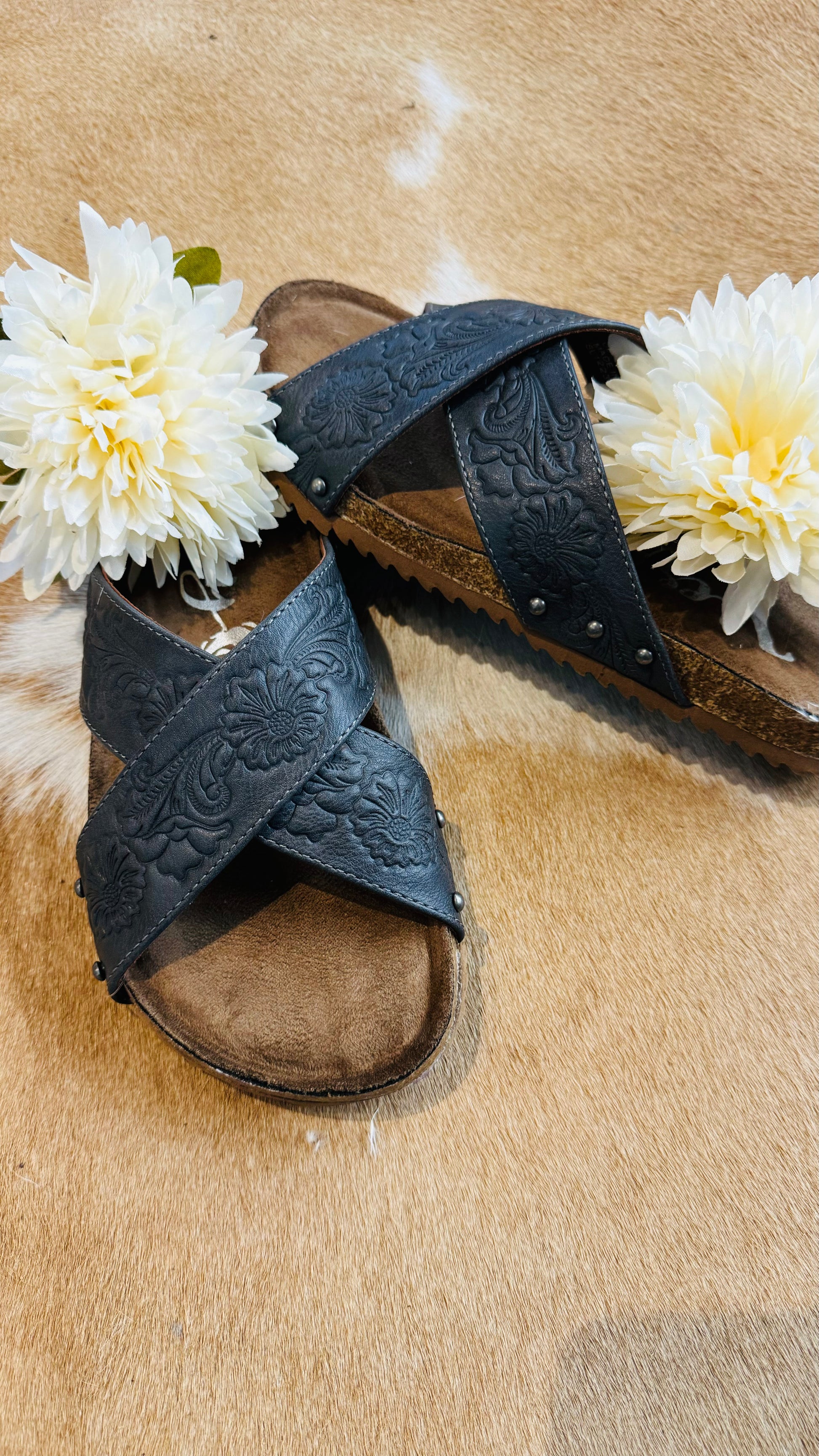A Western Tooled Leather Sandal in Dark Grey. Spring Summer and Fall fun in these cuties.
