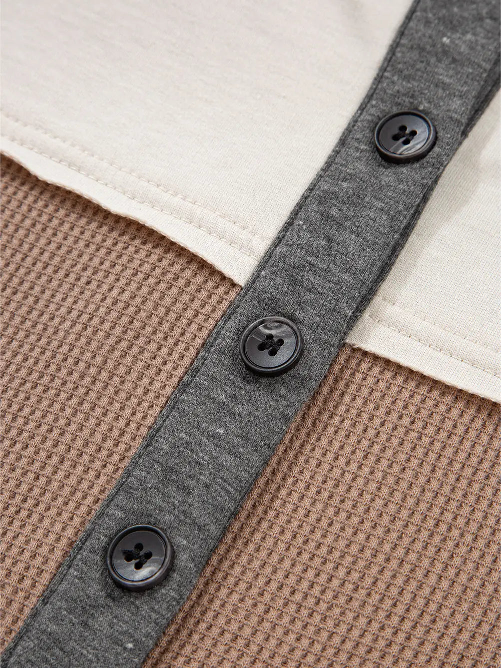 Casual Comfort... This colorblock top is eye-catching to make a statement. It features a Henley design silhouette which make it a classic piece. The waffle patchwork adds texture to this wholesale casual top. Loose fit and comfy for any body shape.