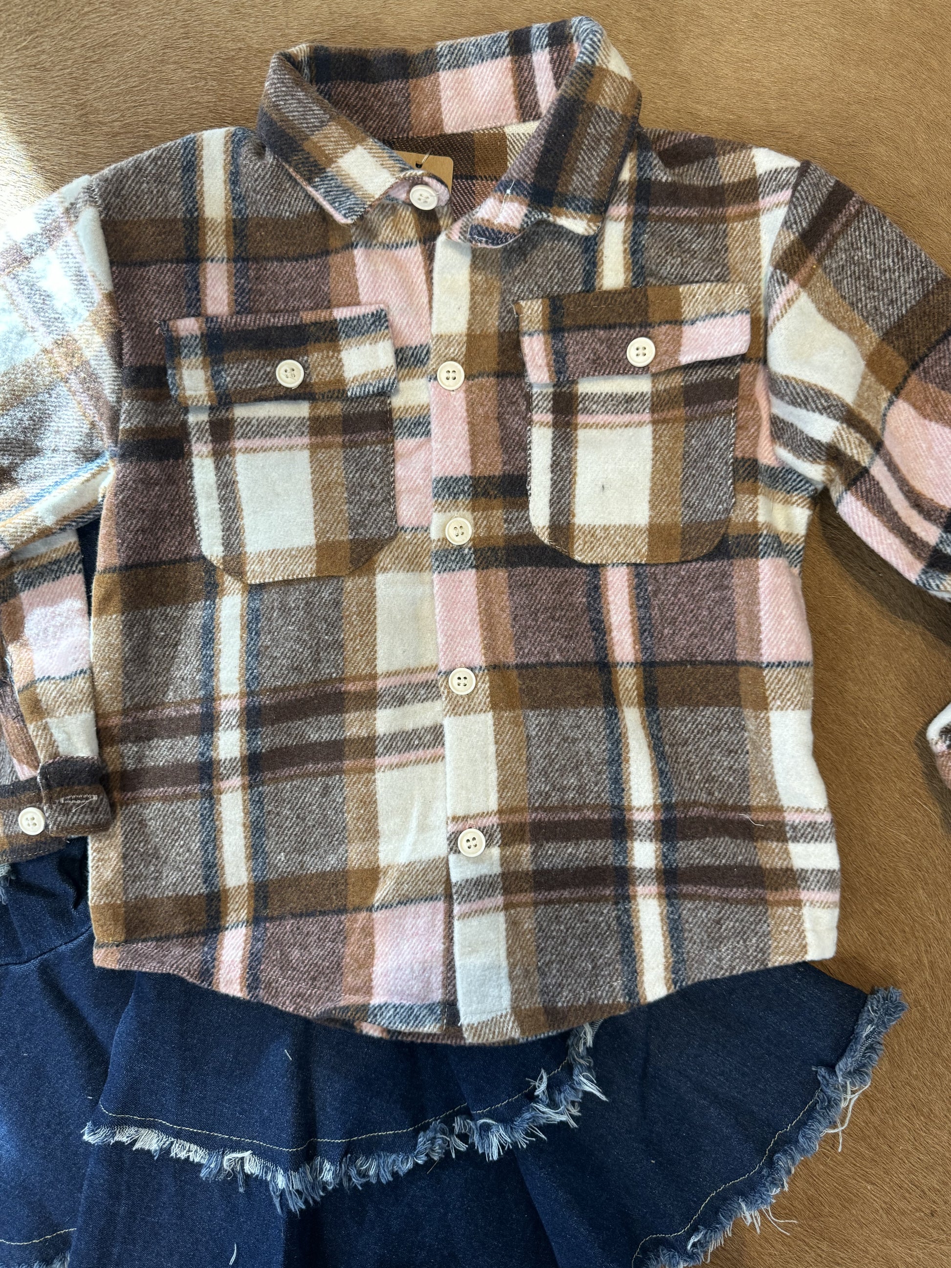 A Cute Flannel for your Mini Me. Pinks tans whites and blacks make this a colorful and fun pattern flannel.
