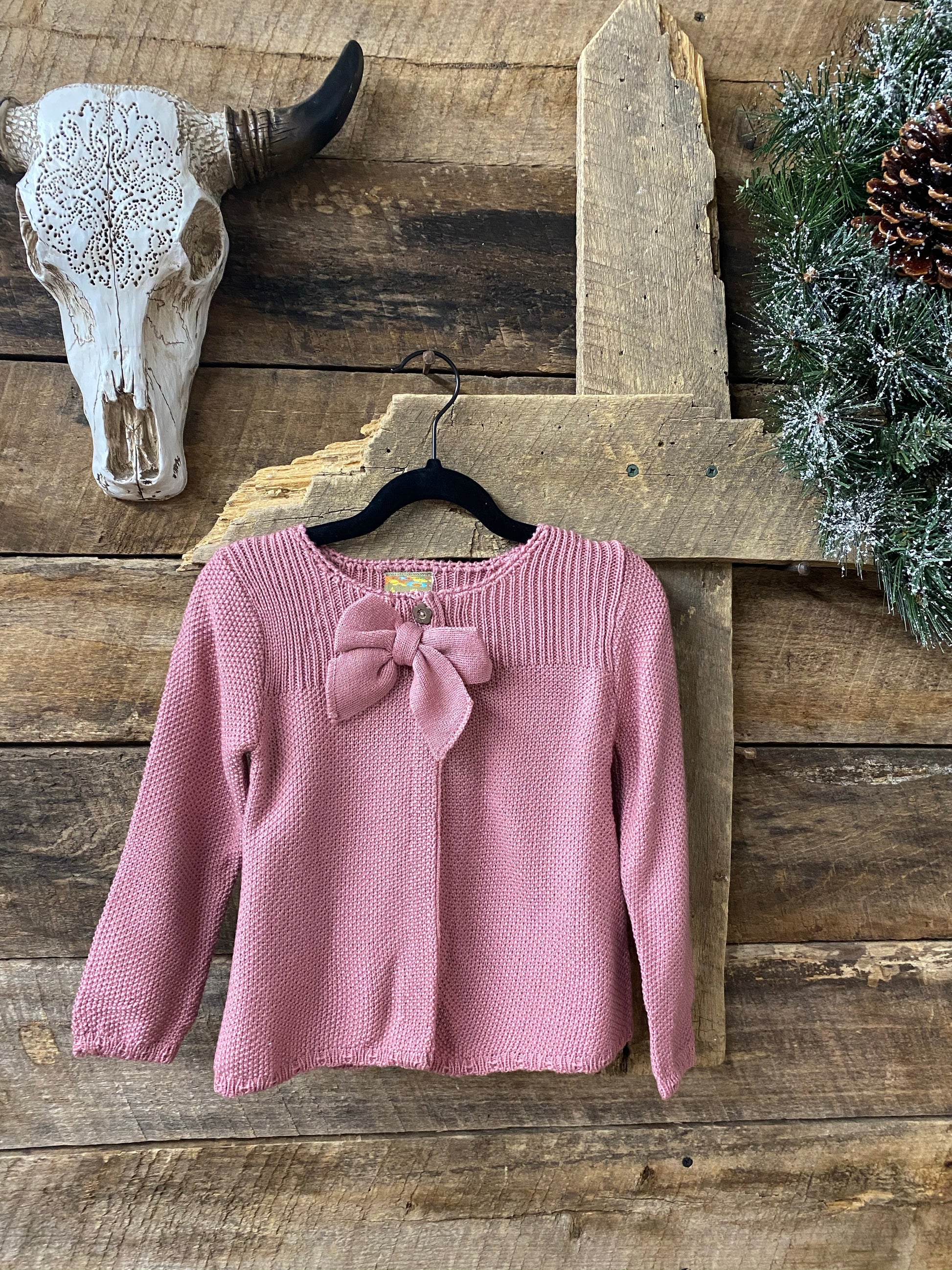 How adorable is this sweater! It buttons at the top and is open through the bottom and that cute little bow just tops it off.