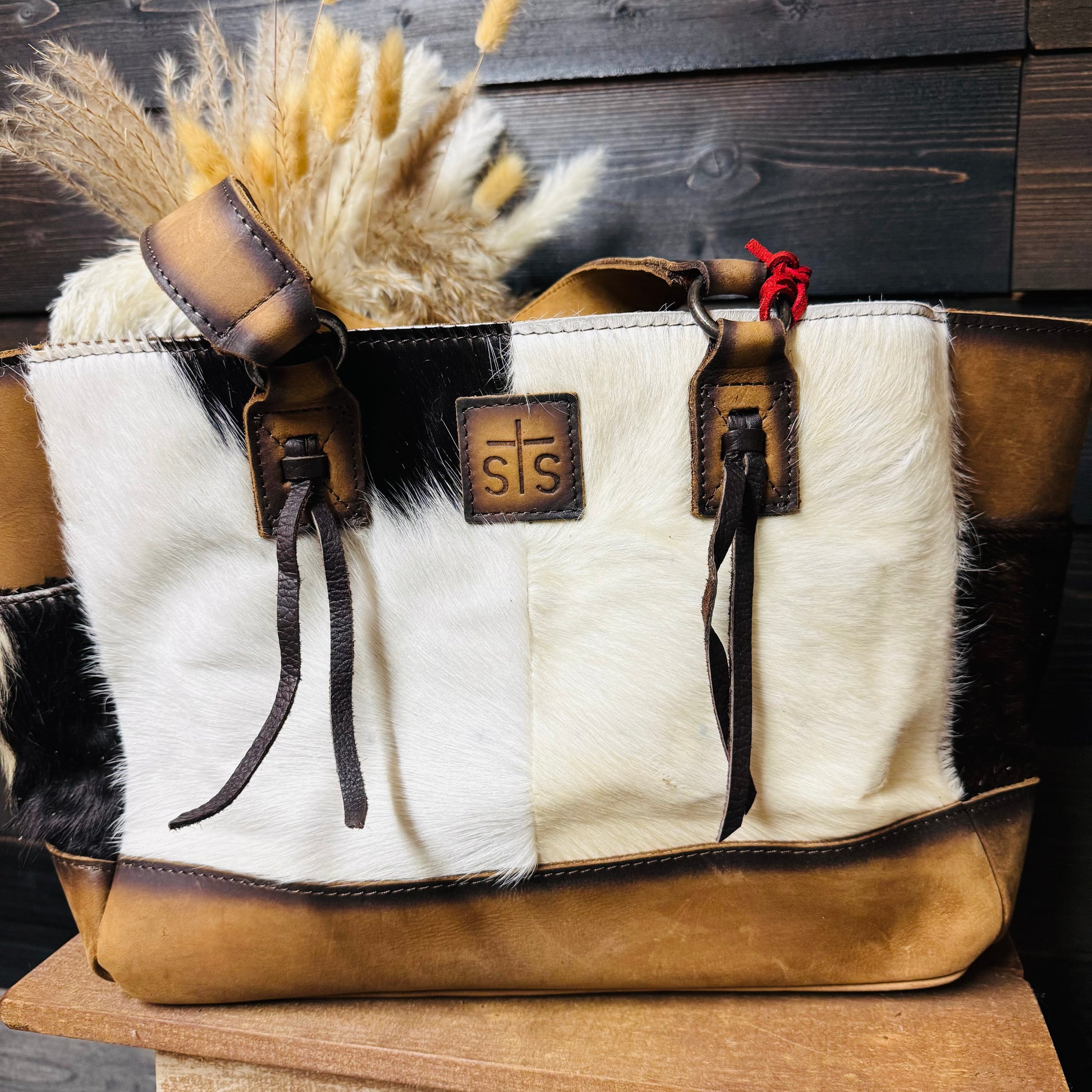 The Cowhide Montana Tote is made from hand selected hair on hide with genuine full grain leather accents.