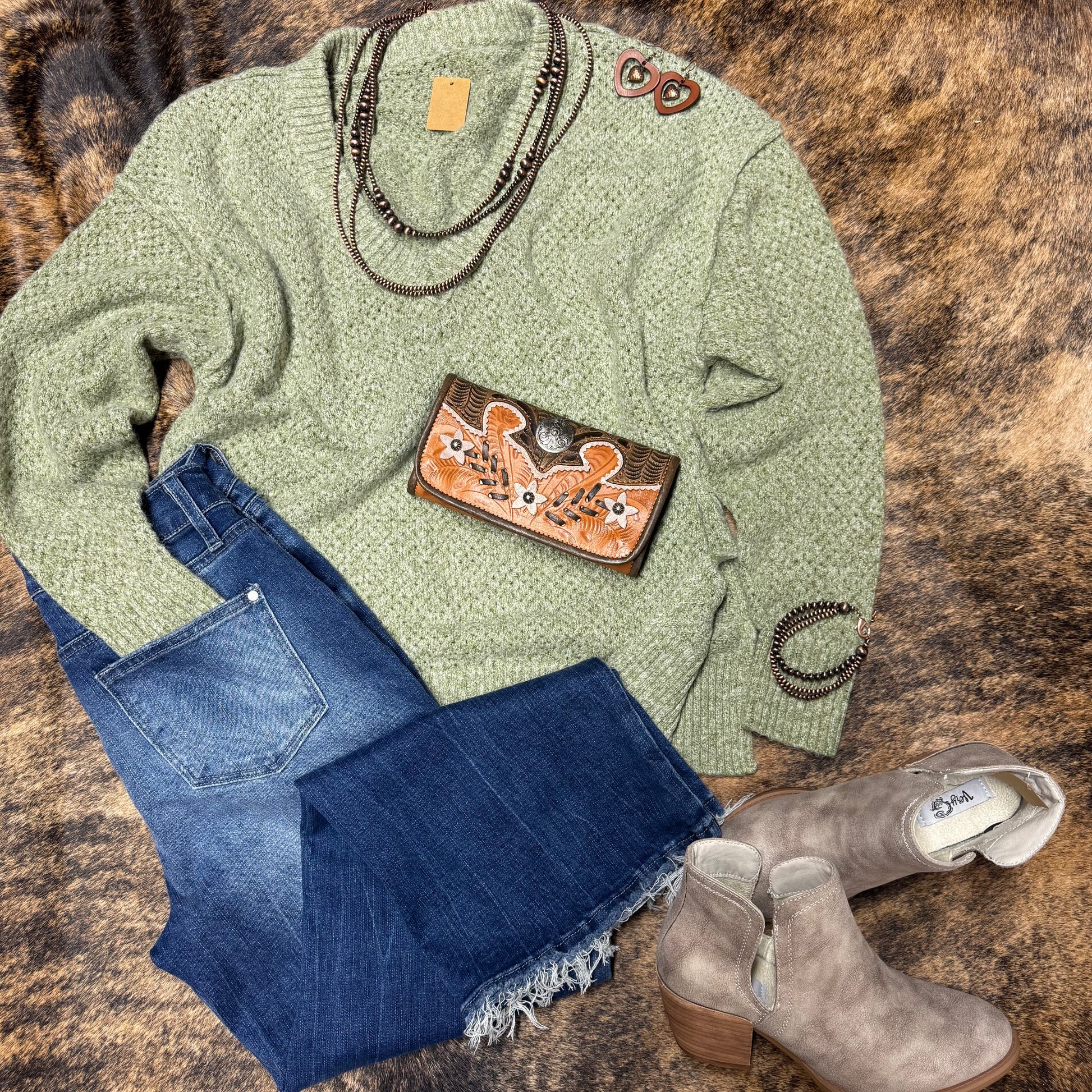 A loose knit v neck sweater that you can dress up or dress down. Fall Winter Spring wear