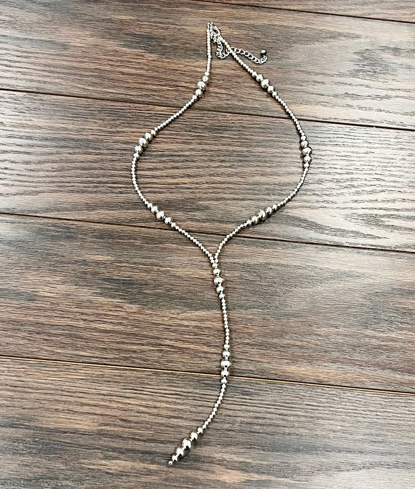 31" to 36" Long, Handmade Clustered Silver Navajo Bead Tassel Necklace * 24" long necklace, 7" long tassel & 5" extender * 4mm silver navajo bead, clustered 6mm, 8mm, 10mm silver navajo bead * 25 grams weight * Nickel, Lead & Chrome free
