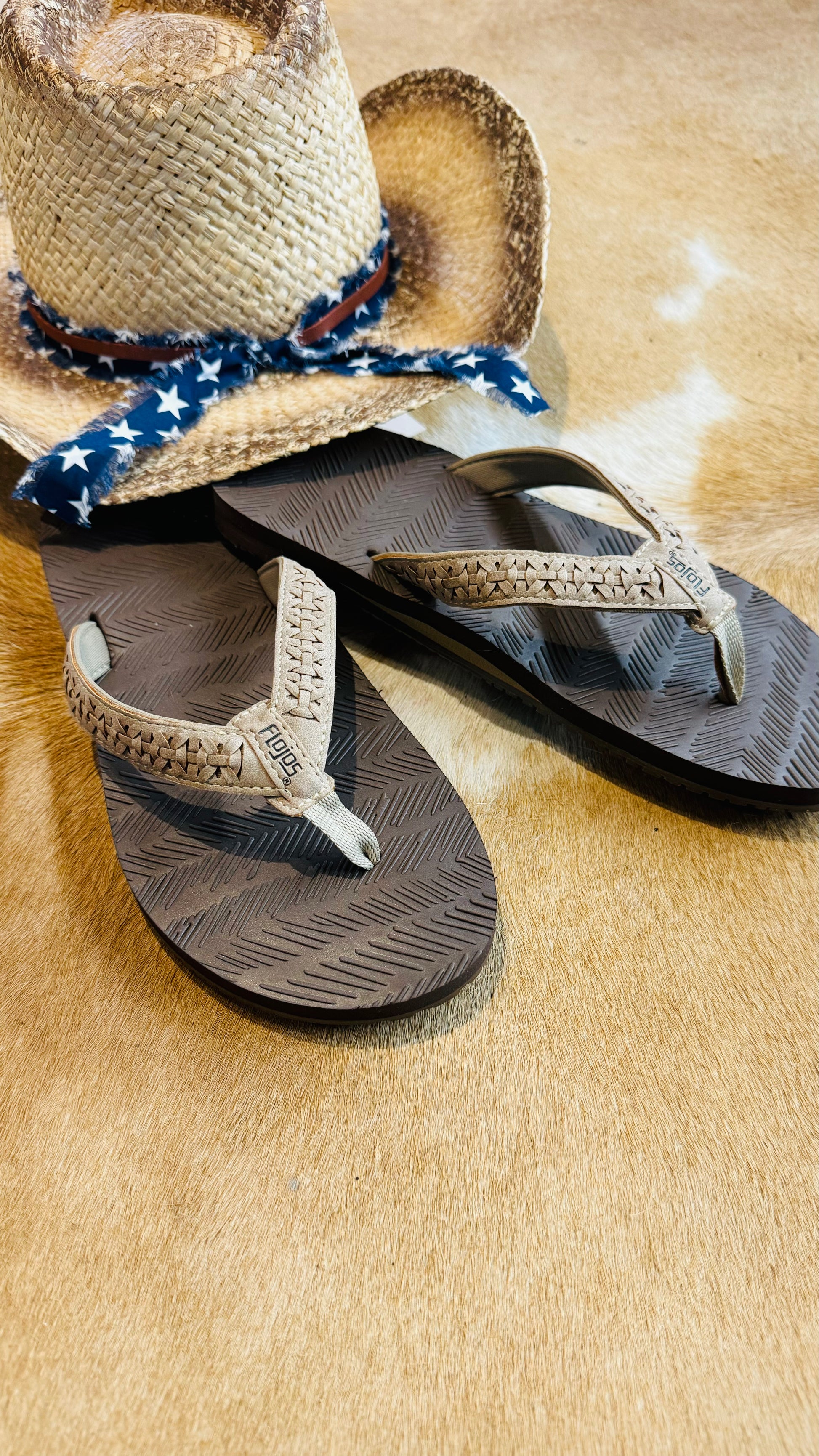 A Spring and Summer Sandal with a bit of a Western Boho Vibe. Interwoven Faux Leather Strapped Sandal in Taupe and Brown. Water friendly with a rubber sole.