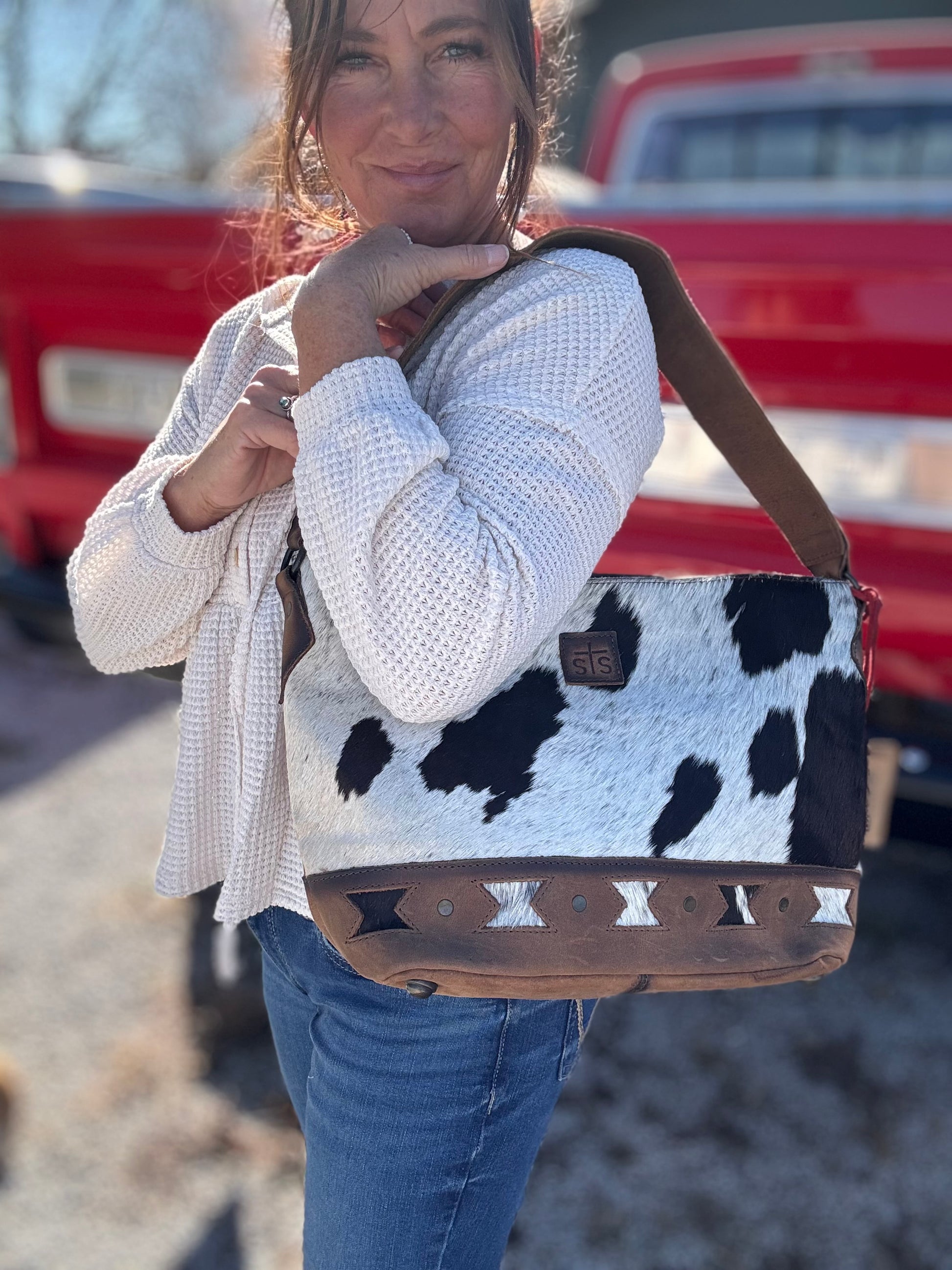 The Roswell Cowhide Tully Purse resembles our best-selling classic hair-on-hide cowhide collection, but is accented with unique aztec cut-outs in the genuine full grain veg tan leather. Finished with oils and wax for a slightly snuffed natural feel.
