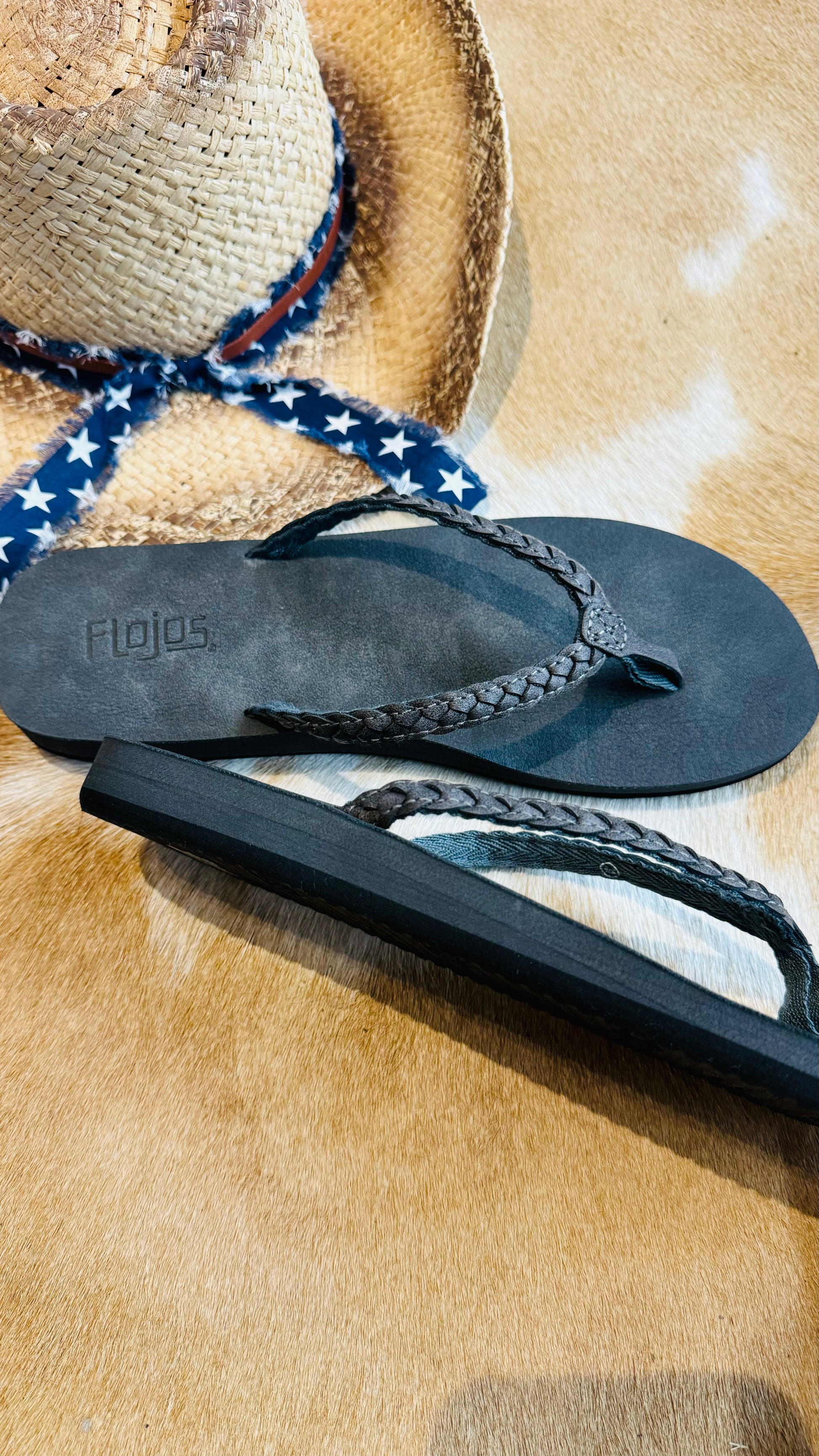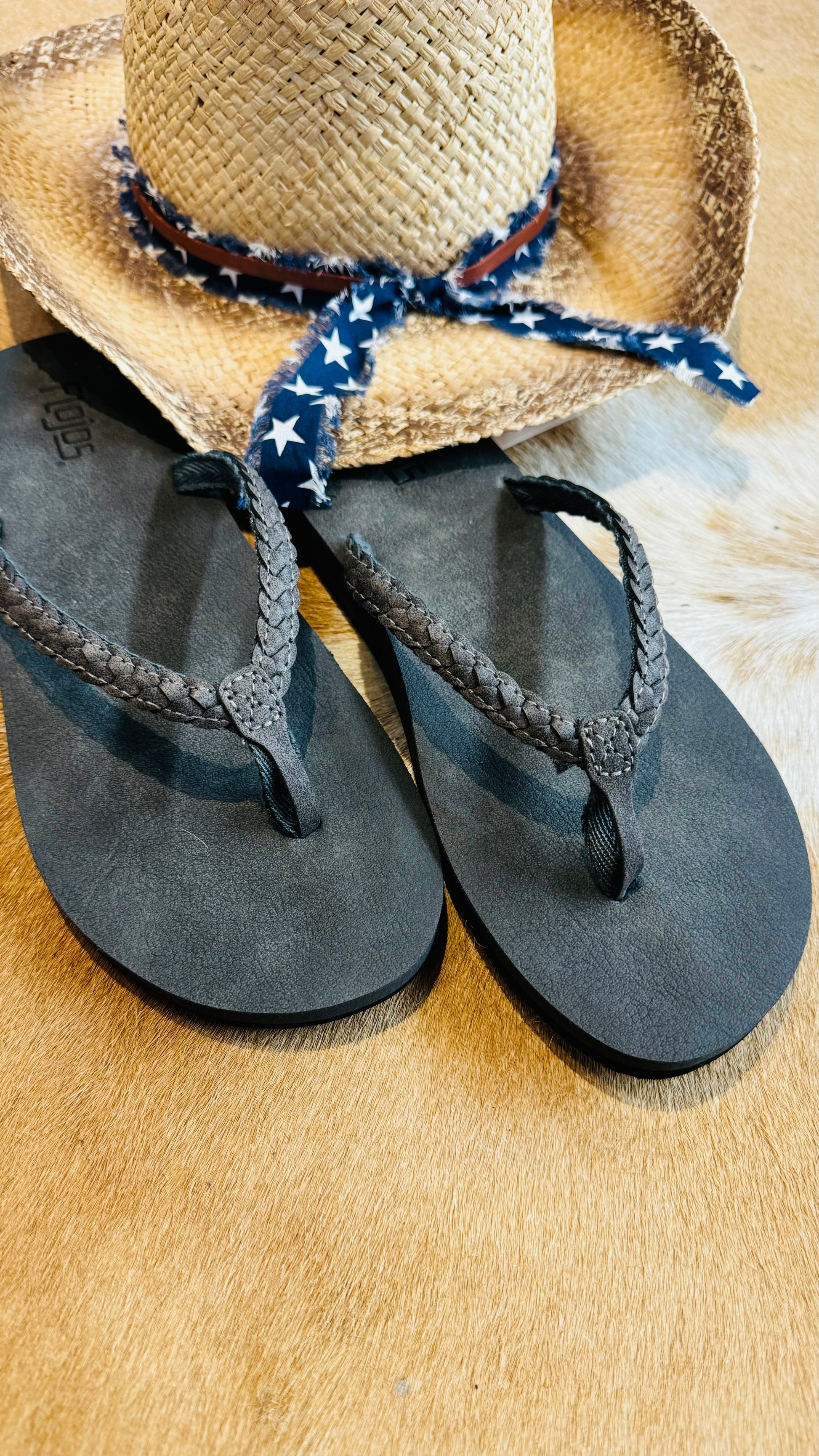 A Charcoal Weaved Faux Leather Sandal. Offers arch support and a suede sole. Perfect for Casual or Dress. A Flojo Flip Flop with Western Boho Vibes