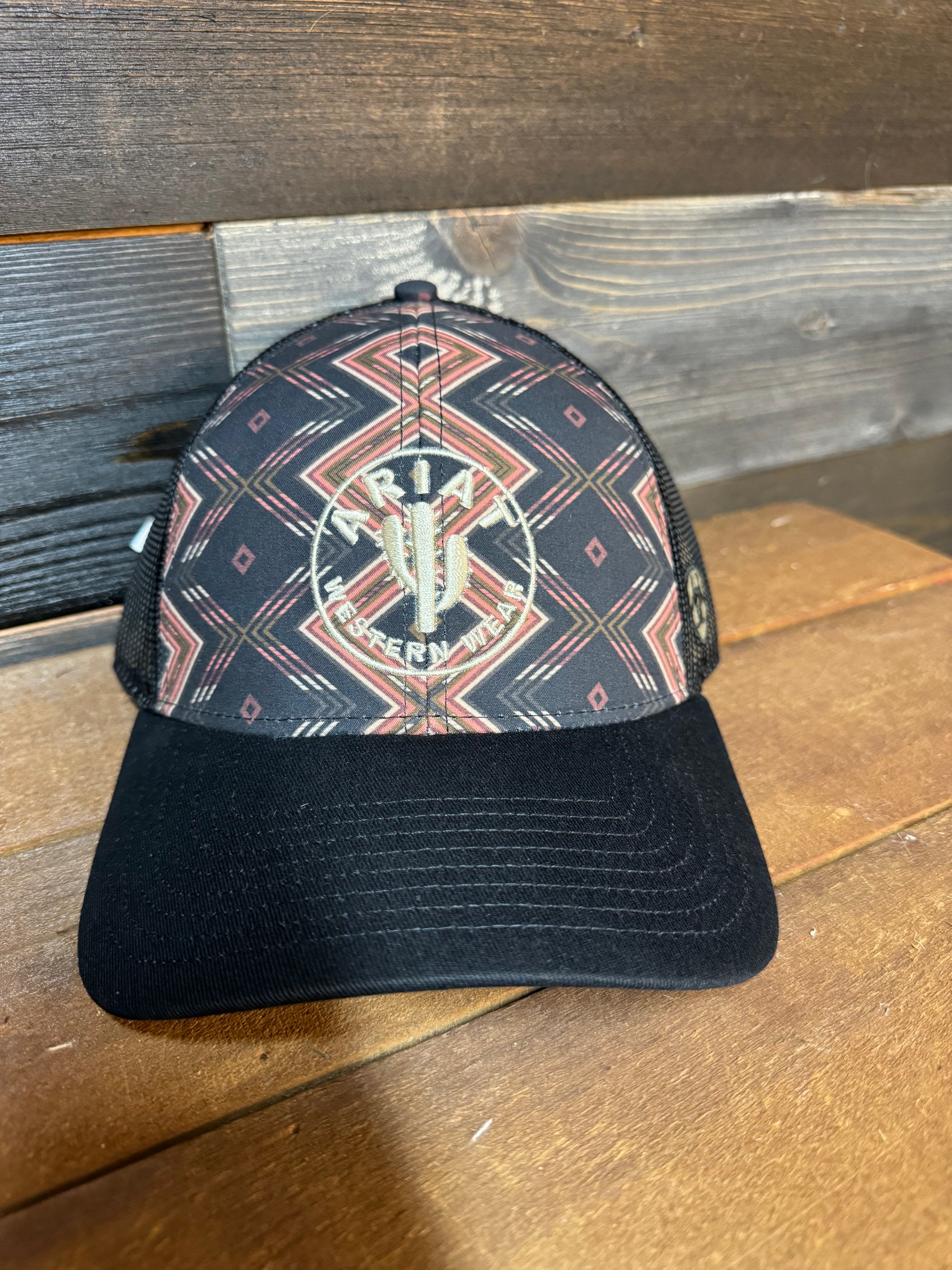 A Sassy Southwestern Ariat Cap for the ladies. All the pretty Desert Tones on a Navy Mesh Snap Back with an Embroidered Cactus