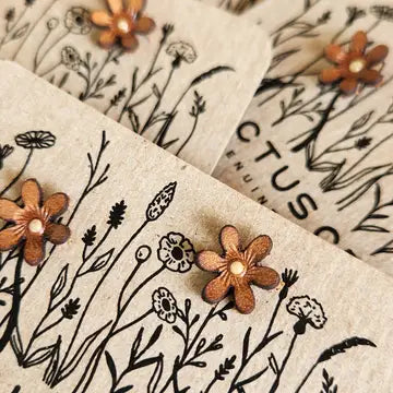 Cute western stud earrings with a vintage western look. Hand stamped and painted on genuine leather. Stainless steel posts