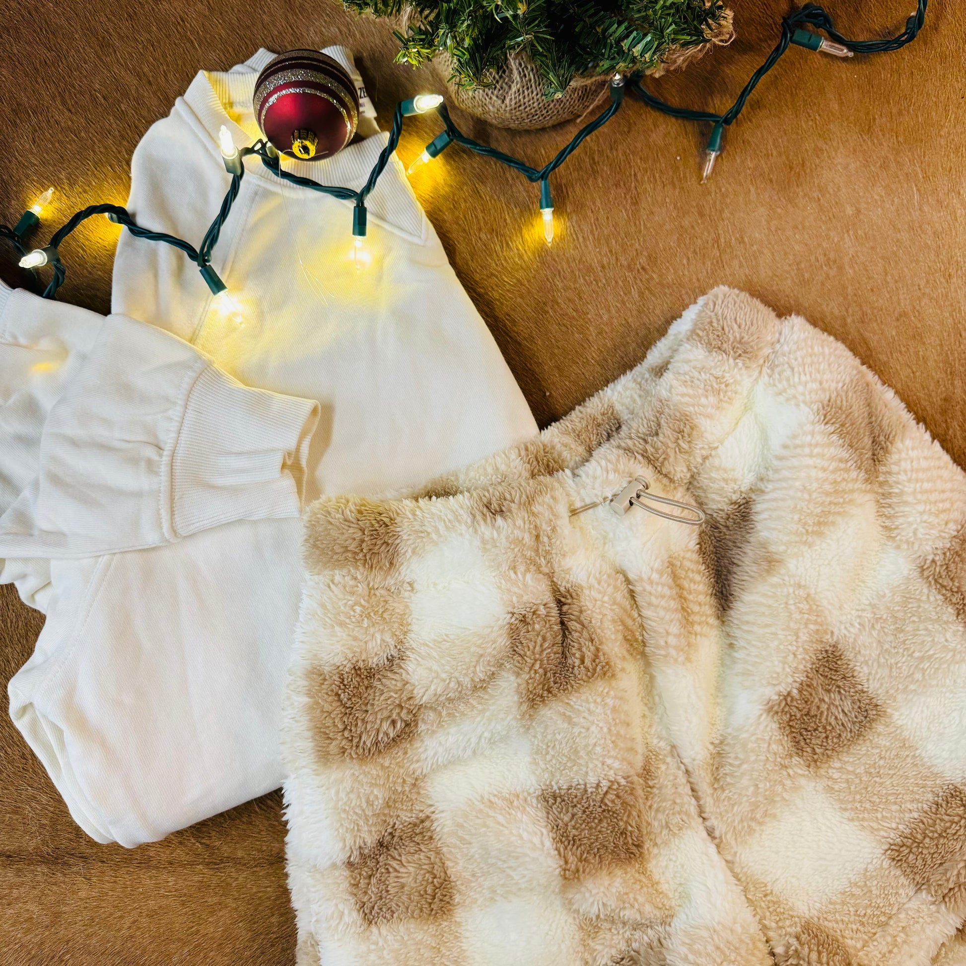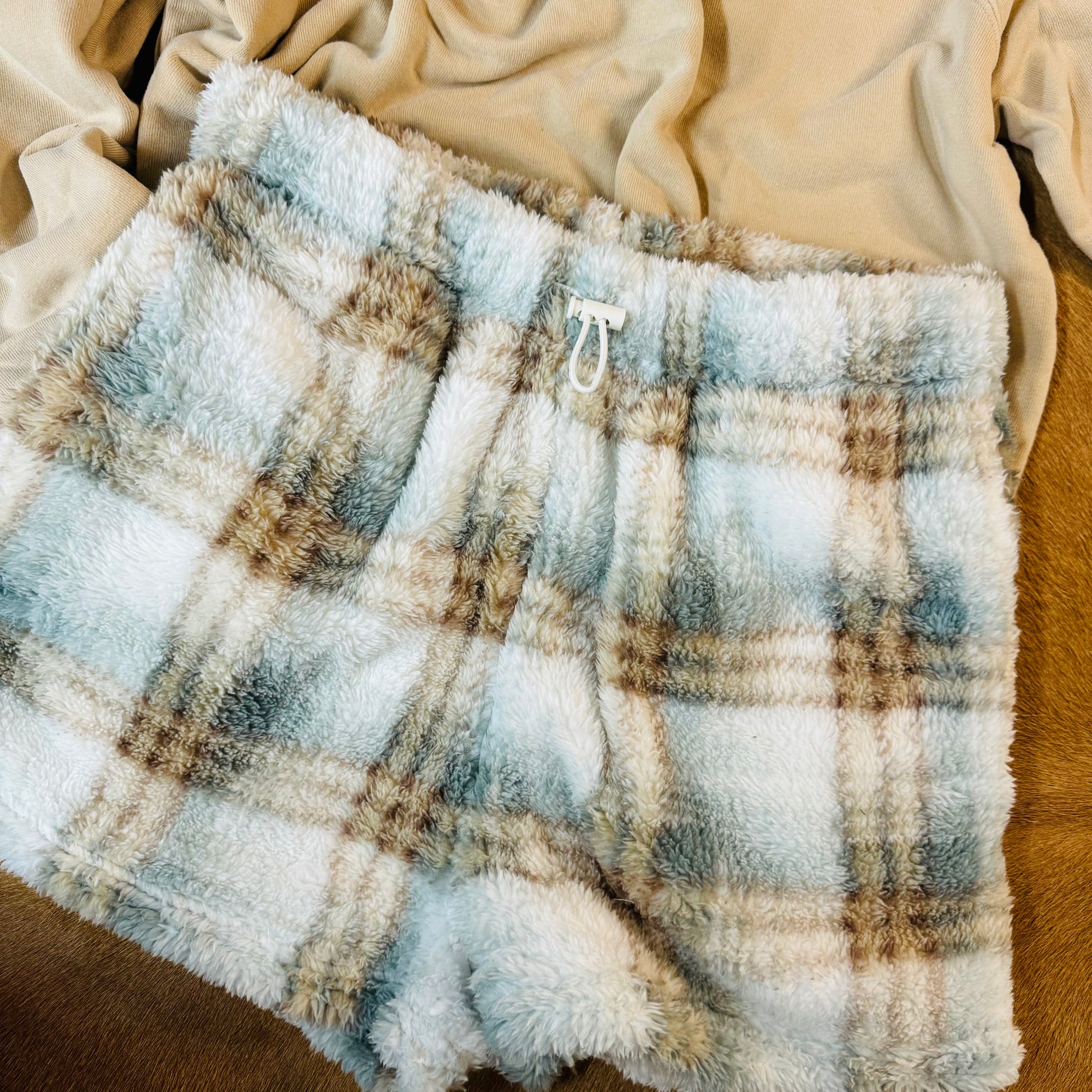 FLUFFY CHECKERED SHERPA FLEECE SHORTS WITH ADJUSTABLE WAISTBAND.